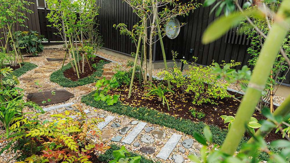 奥行きのあるスペースを活かして通路が印象的な庭にした。四季を通じて花が咲く植栽リスト。サイズが大きくなりにくい、または大胆に剪定しても大丈夫な樹種選定。